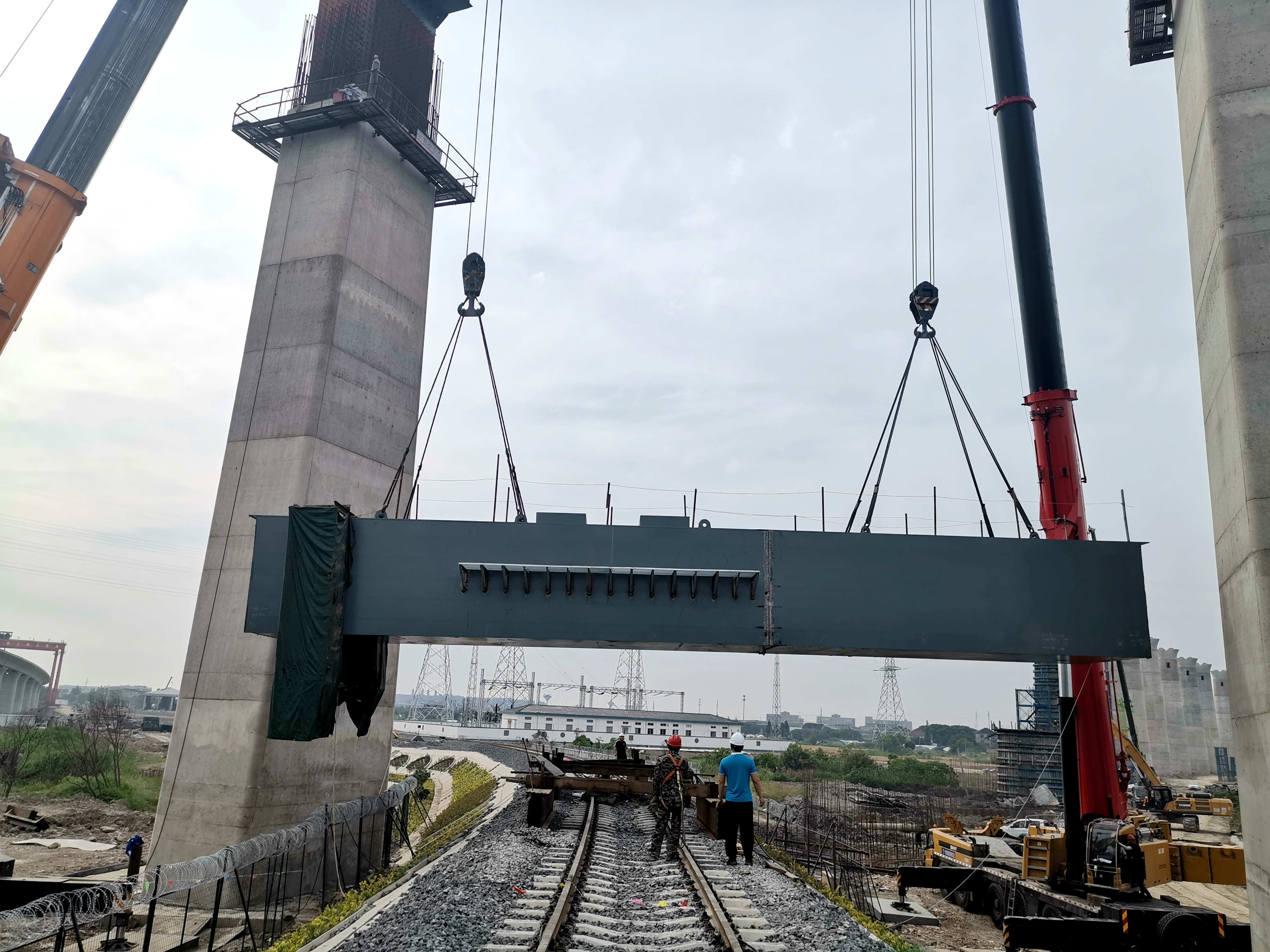 今日早上,南沿江35號門式墩橫梁安裝。